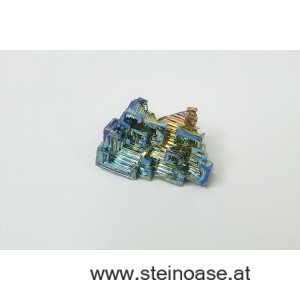 Dieses Wismut kristalliert unter bestimmten Laborbedingungen aus der Schmelze heraus und es entstehen wunderschöne, synthetisch hergestellte würfelähnliche Kristalle mit bunten Anlauffarben (Regenbogenfarben)!
